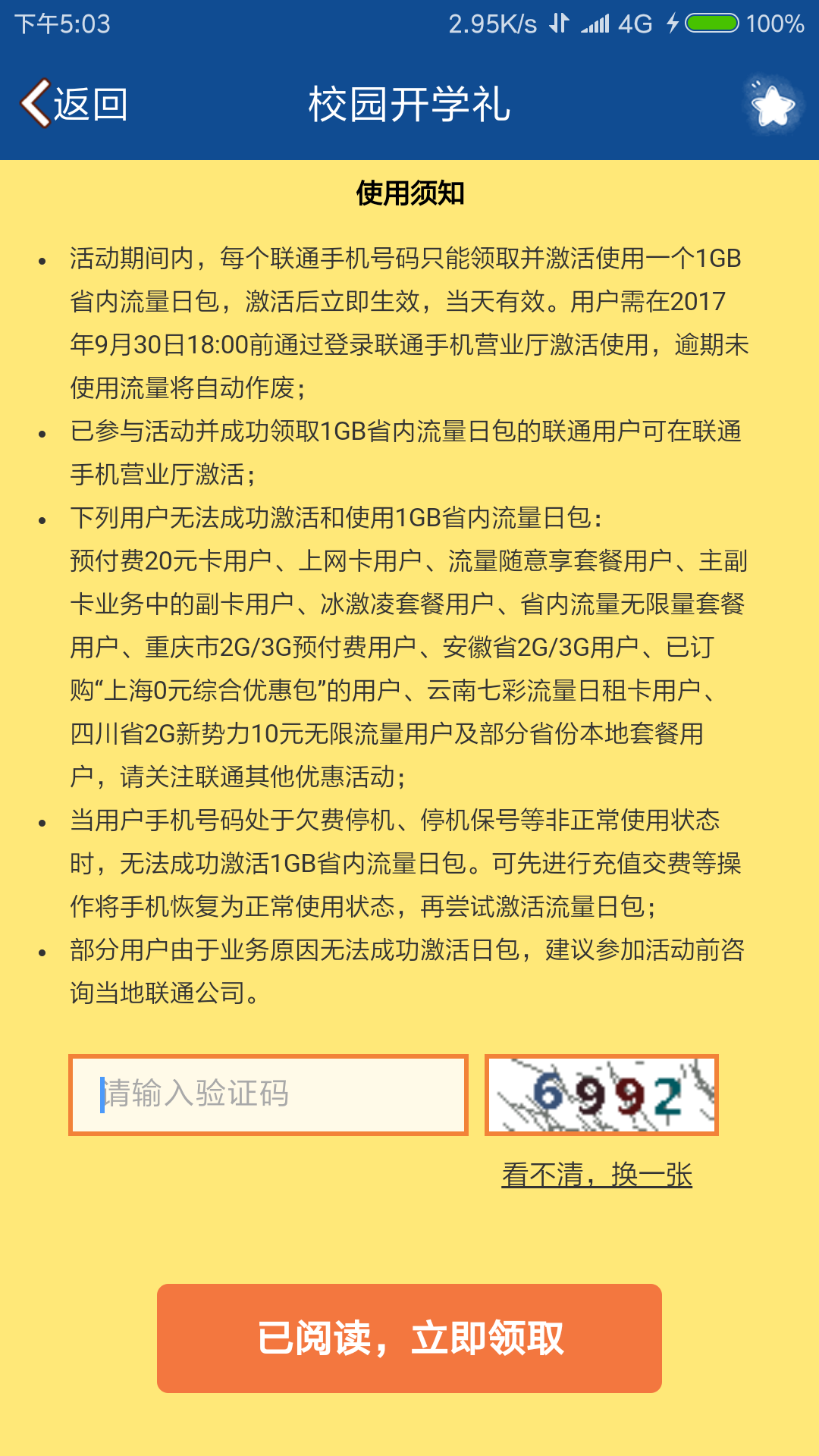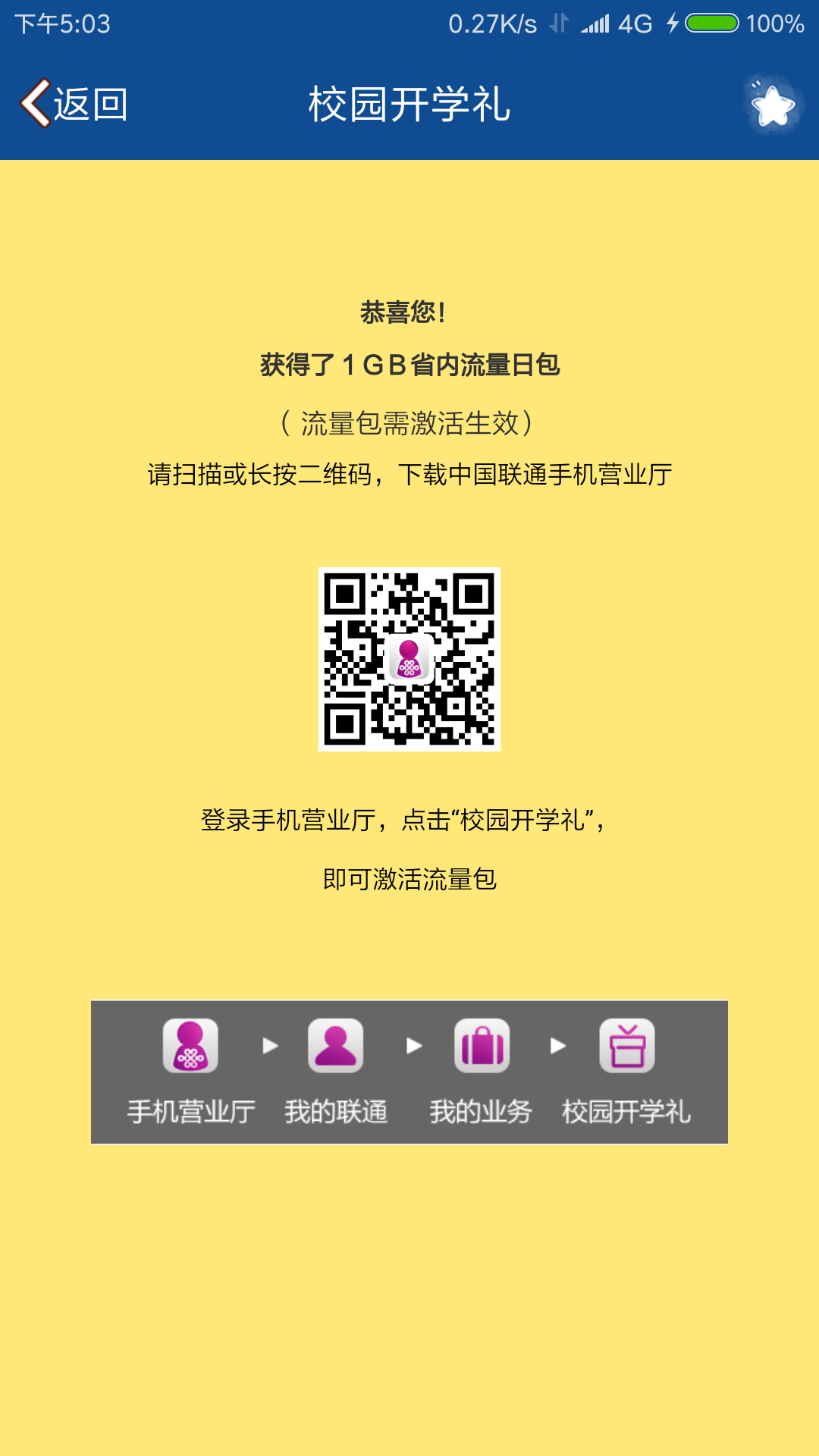 领取之后 下载打开联通手机营业厅 点击我的--我的业务--校园开学礼激活即可