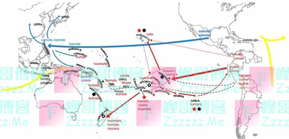此外,1769年库克(James Cook)船队从波利尼亚带回的番薯标本的遗传特征也显示了,在哥伦布之前,波利尼亚就种有番薯了,千真万确。