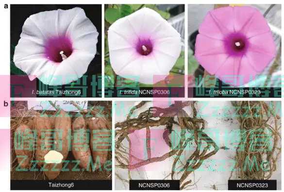 番薯(Ipomoea batatas)、大星牵牛(Ipomoea trifida)与三裂叶薯(Ipomoea triloba)对比