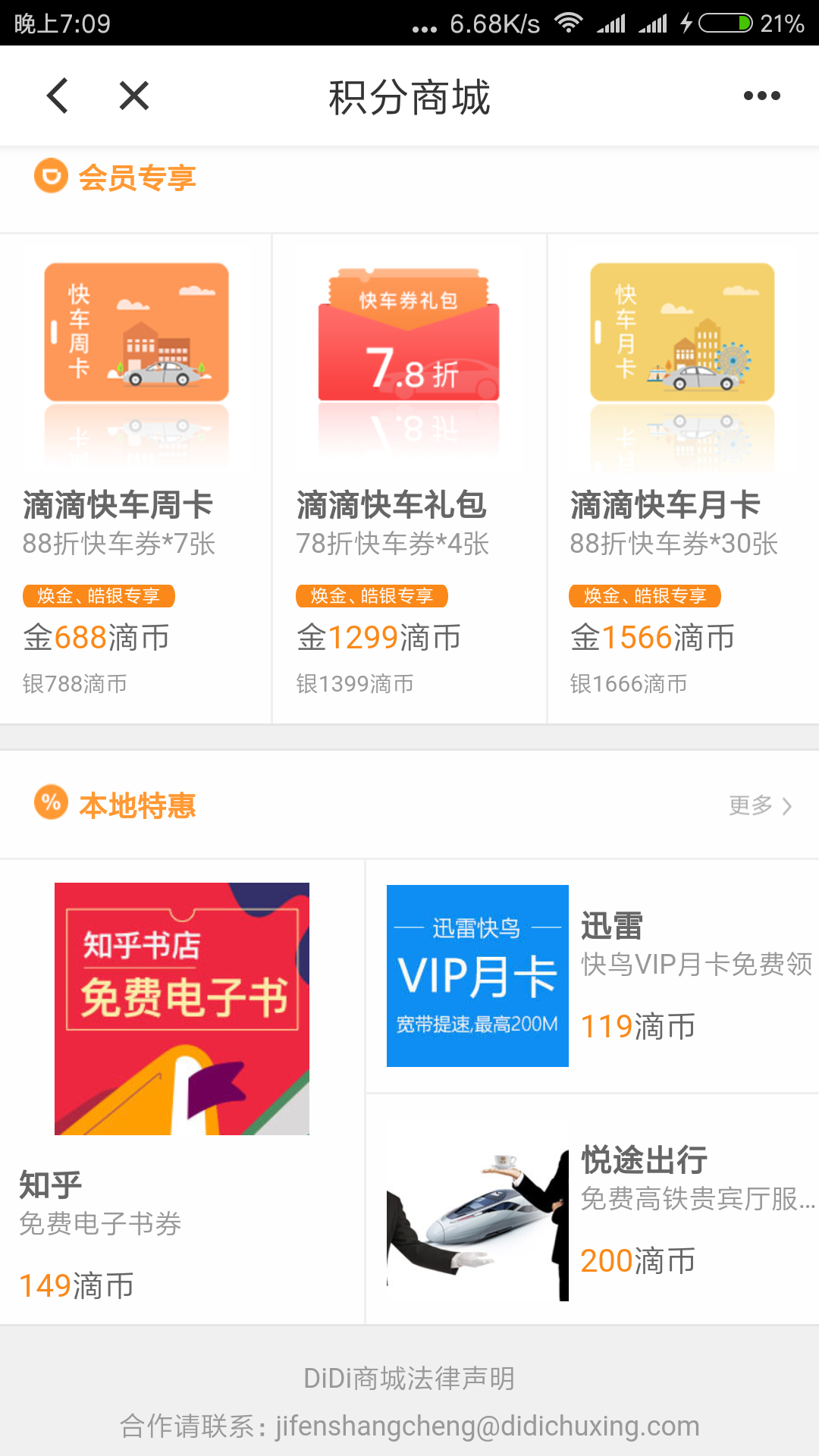 打开滴滴出行APP → 钱包 → 滴币 → 积分商城 → 本地特惠 → 119滴币,快鸟VIP月卡免费领