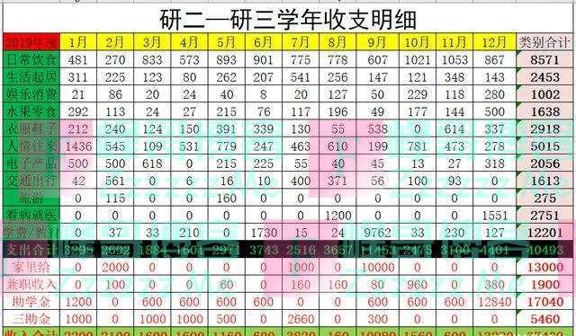 1、2019年从1-12月份,详细的统计了个人日常饮食,生活起居,娱乐消费,水果零食,衣服鞋子,人情礼往,电子产品,交通出行,旅游,看病,学费等项目,最多的一个月消费是在9月份,合计11000多元,原因是学费交了9700多元。其余月份的平均开支在2500元左右,全年总支出4万多元。