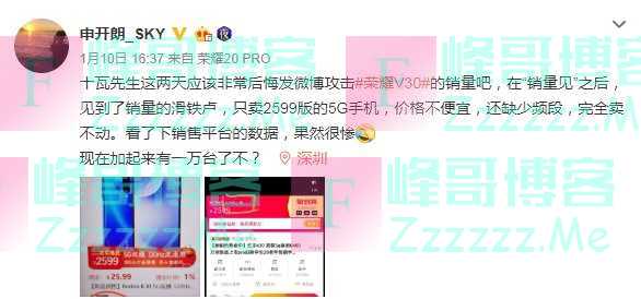 红米K30首销只有8+128GB版本,价格为2599元。但是2个小时全平台全部售罄,还在京东和天猫拿下了双冠军。紧接着红米K30 5G在本周五再次开售。紧接着荣耀申开朗就开始拿数据说话了。表示卢伟冰是不是很后悔攻击荣耀V30的销量,现在看看自家产品的销量,是不是看到了一个“滑铁卢”。价格不便宜,还缺少频段,完全卖不动,两个平台的销量加起来还不到一万。