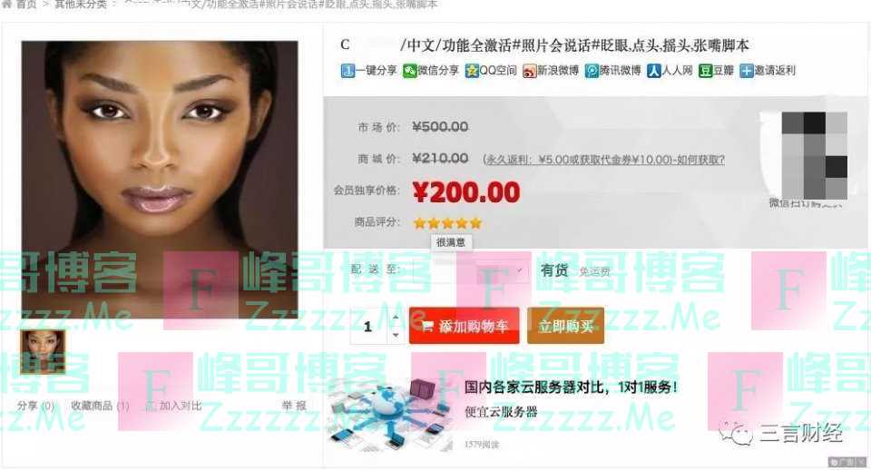三言财经找到几家售卖此款软件的店铺,这款软件备注着照片会说话、眨眼、摇头、动态人脸识别过机的字眼,全套售卖价格在200元左右。