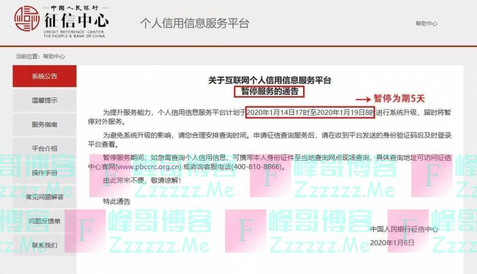 1月6日央行征信中心官宣:个人信用信息服务平台计划于2020年1月14日17时至2020年1月19日8时进行系统升级,届时将暂停对外服务。