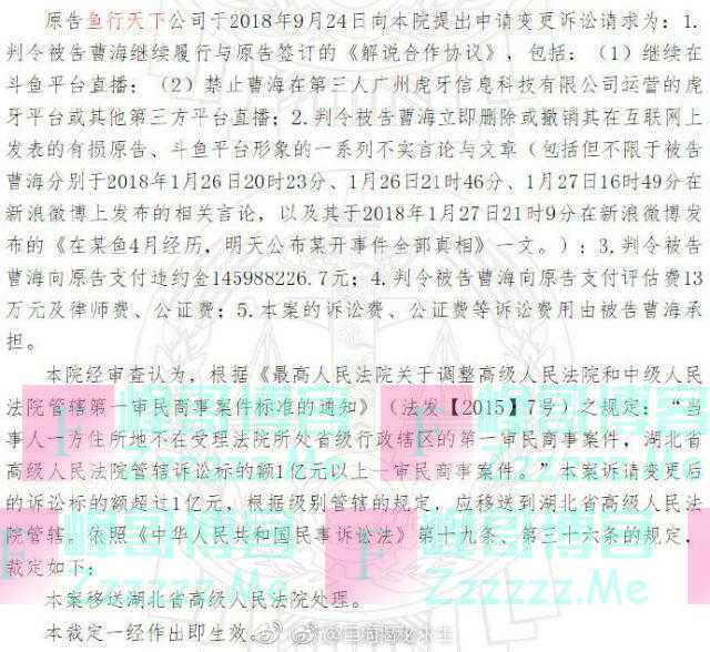 3.判定被告曹海向斗鱼支付违约金145988226.7元。