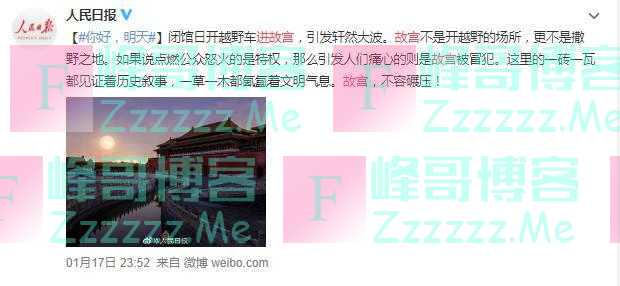 就在昨日午夜,人民日报对待此事发表了长篇大论:“闭馆日开越野车进故宫,引发轩然大波。故宫不是开越野的场所,更不是撒野之地。如果说点燃公众怒火的是特权,那么引发人们痛心的则是故宫被冒犯。这里的一砖一瓦都见证着历史叙事,一草一木都氤氲着文明气息。故宫,不容碾压!”