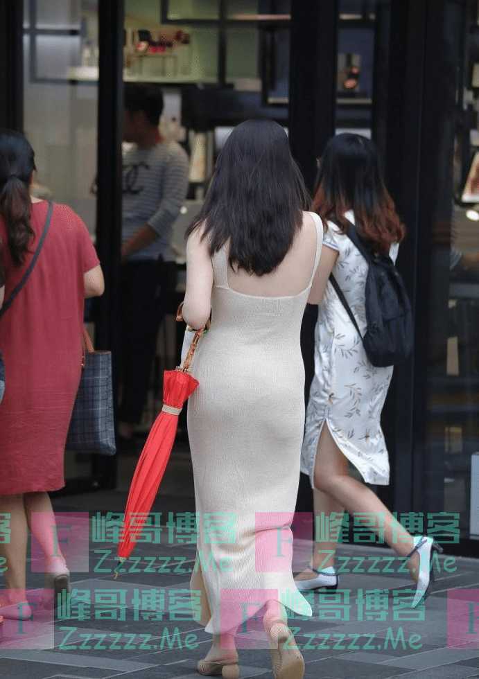 图中的美女身穿一件米白色的连衣包臀裙,从正面看的话,领口是一个大V领的设计,虽然很性感,但是又不会让人觉得轻浮。而她手中挎的这一个精致的圆柱形小包包,更是把她优雅的气质彰显无疑。可能是因为下雨天,她把一把大红色的雨伞挂在了自己的胳膊上,大红色和自己穿的米白色相互映衬,给人一种高贵的既视感。而当她转过身的时候,这件裙装的背面设计也同样非常的迷人,类似于露背装的设计,给予了她清凉感,而包臀裙针织的材质,也是彰显了若隐若现的性感。