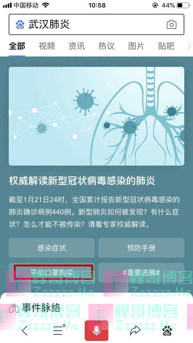今天,在搜索肺炎相关新闻时,小编意外发现了一个还可以买到平价口罩而且配送时效性还不错的地方。那就是在百度搜索"武汉肺炎"、"新型冠状病毒"等关键词后,首屏就有一个"平价口罩购买"入口,可以看到百度渠道专属货源的N95口罩2只仅售8元钱,而且春节期间照常发货,相信这样的消息可以让很多人的返乡之路更加安心。