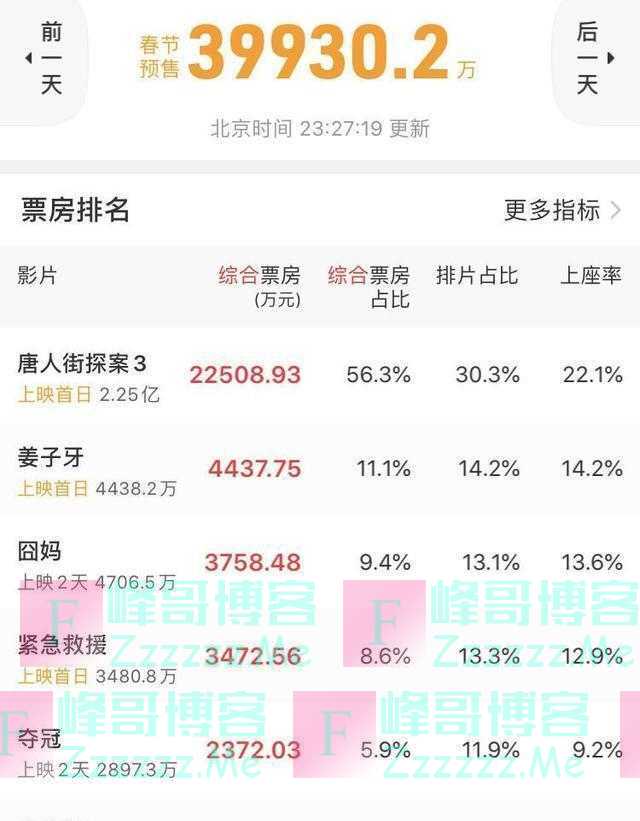 而从春节档预售票房成绩来看,截至目前,陈思诚执导的电影《唐人街探案3》预售票房2.25亿,高居榜首,远远甩开其他春节档电影,其他春节档电影预售票房均未破亿,《姜子牙》预售票房4438万,徐峥的电影《囧妈》仅有3758万,巩俐主演的电影《夺冠》和成龙大哥主演的电影《急先锋》预售票房成绩都不甚理想。