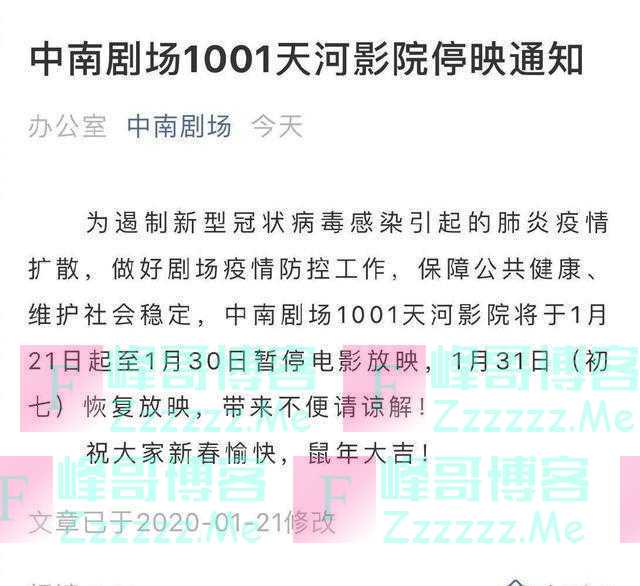 为了遏制新型冠状病毒感染引起的疫情扩散,做好疫情防控工作,保障公共健康,在疫情最严重的武汉地区已有不少电影院春节档暂停放映,将于1月21日至1月30日暂停电影放映,1月31日才恢复放映。