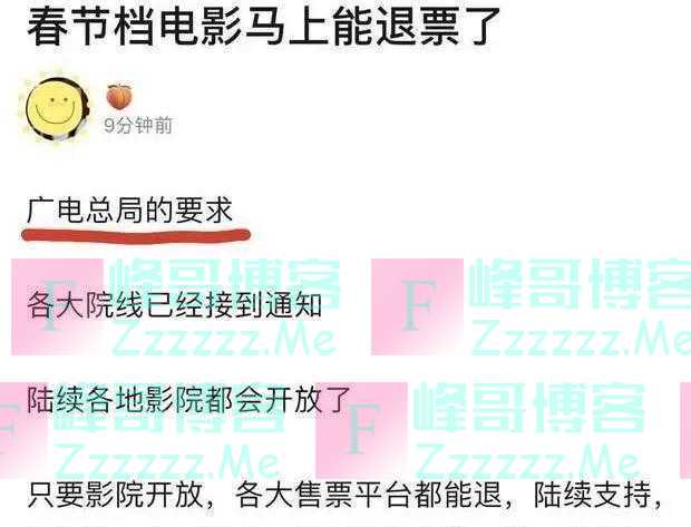 各地也有电影院春节档暂停放映,而且按照广电总局的要求,各大院线已经接到春节档退票的通知,只要院线开放,各大售票平台都能够退票。