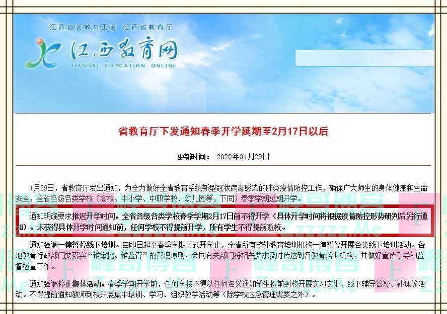 江西:全省推迟开学时间,不得早于2月17日;同时2月10日起,全省中小学将实施网络教学。