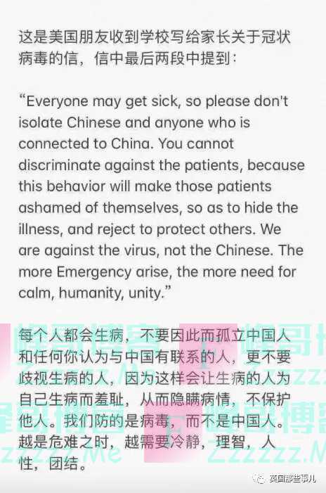 正如一封美国学校写给家长的信中提到的,“我们要防的是病毒,不是中国人。”