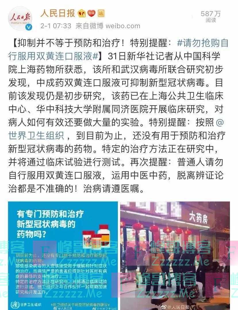 昨晚,一则“研究发现:双黄连口服液可抑制新型冠状病毒”的消息刷爆了朋友圈。不少人想要网购,却发现网上药店基本卖光。于是,大量民众一股脑涌向24小时售药的药店,导致线下药店也很快被抢购一空。这种抢购,说明大家自我保护和安全防范意识很强,这个值得肯定。但我们也不能乱用药,不然可能会产生其它隐患。