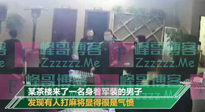 根据该茶楼监控显示,该男子戴口罩穿军装,从外民进到茶楼,随后就问前台的老板,大家都在歇业为什么你们这里还在营业,并且还聚众打麻将,这是绝对不允许的,而且该男子还装得非常像,你们自己在家玩一玩就好了,一起出来在公共场所玩,这是在和政府作对,每个人罚1000元。