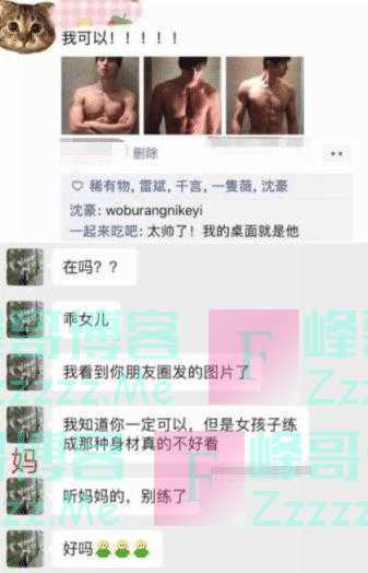 这位小姐姐本来觉得这张照片中的小哥哥很帅气,肌肉也很多,所以就顺手发圈,并配文字说自己要努力练一练。但当时忘记屏蔽妈妈了,随后便是被妈妈小窗口谈话了,妈妈一直劝她别练了。