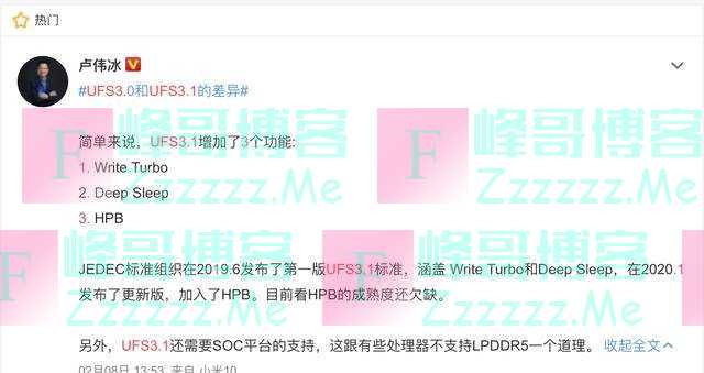 卢伟冰在微博表示,JEDEC标准组织在2019年6月发布了第一版UFS3.1标准,该版本涵盖了Write Turbo、Deep Sleep两个新功能。到了2020年1月,JEDEC标准组织发布了更新版,加入了HPB功能,不过目前HPB技术还不成熟。此外,UFS3.1需要处理器的支持。