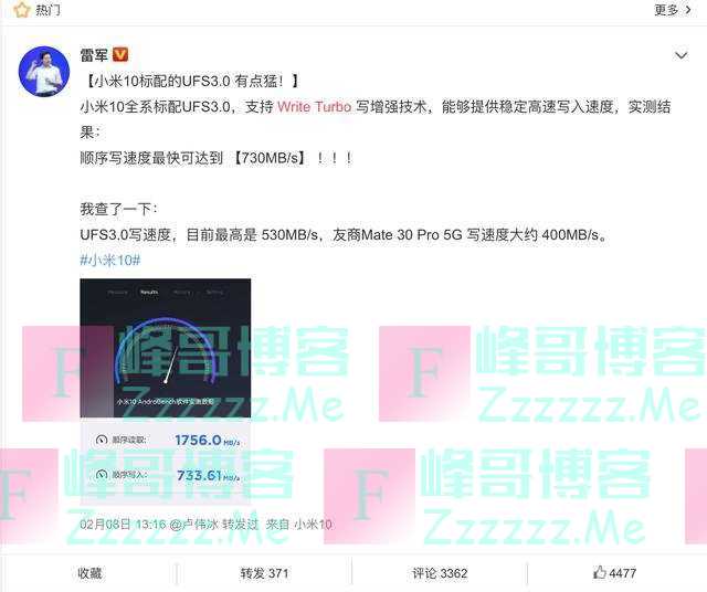 不过,这并不代表小米10系列会标配UFS3.1。雷军在微博表示,小米10标配的UFS3.0有点猛,支持Write Turbo写增强技术,能够提供稳定高速写入速度,并晒出了实测数据。简单地来讲,小米10系列还是UFS3.0的标准,只不过UFS3.1的Write Turbo功能被下放到了UFS3.0,可以获得比UFS3.0更快的顺序写入速度。