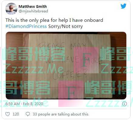 史密斯写道:“‘钻石公主号’已经加大了餐饮服务的力度。不要相信那些宁愿在美国医院‘度蜜月’的人。隔离期结束后,你可能得把我拖下船去。”