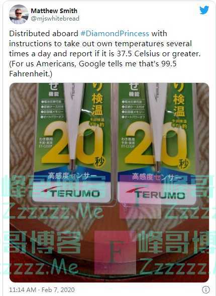史密斯还分享了一张游轮工作人员分发给乘客的体温计照片。