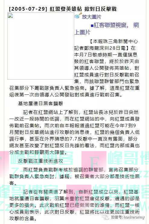 自从LION宣布红盟2004年解散后,很多人无家可归,为了弥补红客解散的创伤,发扬红盟精神,在解散后的第2个星期冰儿重新建立红客联盟。此处为2005年重建时文汇报报道: