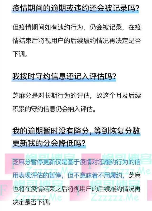 支付宝推出了一项新规,本月的芝麻分暂停更新,如果在这段时间里有逾期也不会造成影响,在疫情胜利后再重启芝麻分评估。但这并不意味着花呗不用还了,只是在这段时间内逾期不会造成芝麻分的减少,不过还是不建议大家逾期,因为芝麻也提醒了大家,会在疫情结束后视用户情况再决定,所以大家还是老老实实的履约,如果实在没办法再慢慢沟通一下。