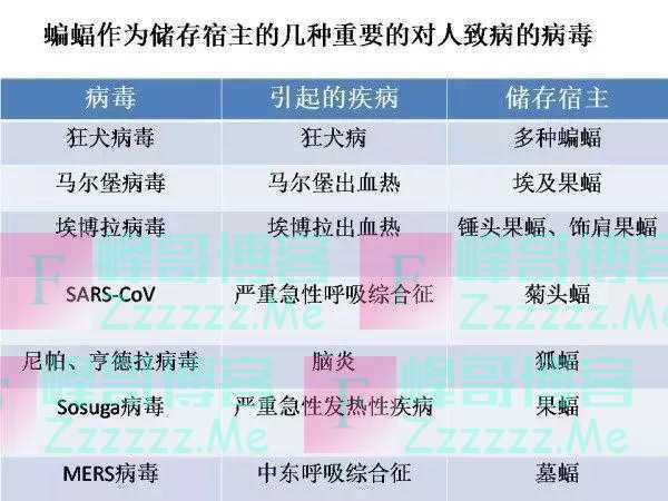 通过这次疫情,我们知道了近千种的蝙蝠共携带了137种病毒,其中人畜共患病毒61种——埃博拉、冠状病毒、尼帕病毒、亨德拉病毒、马尔堡病毒等都有可能来源于蝙蝠。除了蝙蝠,整个野生动物约有200种传染病、80种寄生虫病,其中半数可以感染给人。