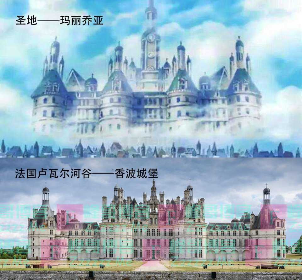 说到海军,自然会让人联想到世界政府。在《海贼王》中世界政府由天龙人掌权,是世界最高政治权力机构,天龙人自称为“神”,因此居住的玛丽乔亚也被称作“圣地”。圣地玛丽乔亚的设计几乎完全照搬法国卢瓦尔河谷的香波城堡。香波城堡和玛丽乔亚同样是法国王权的象征之一。
