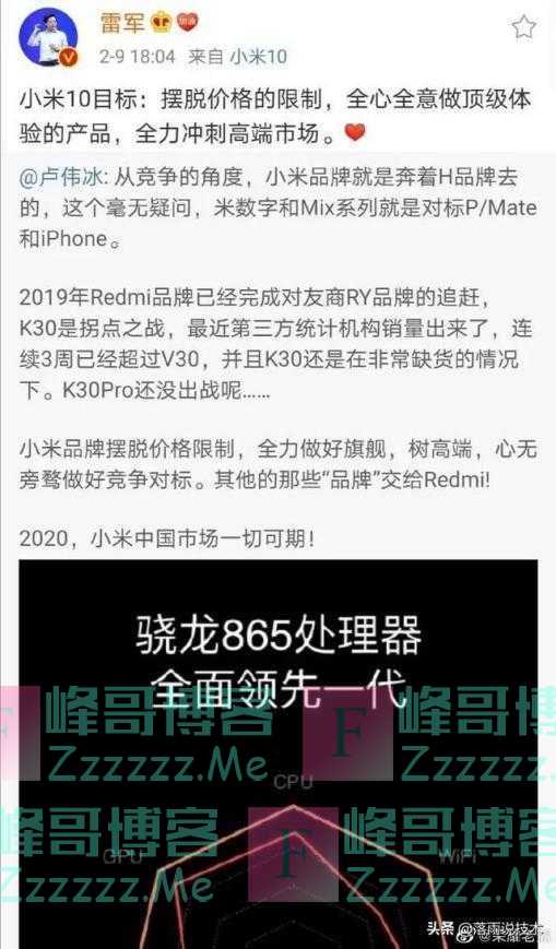 2月9日,卢伟冰发布了一条微博,他表示,从竞争的角度,小米品牌是奔着H品牌去的,在2019年Redmi已经完成对友商RY品牌的追赶。同时,小米品牌将摆脱价格限制,做高端产品。随后雷军转发表示,小米将全力冲刺高端市场。从字里行间直指友商荣耀。