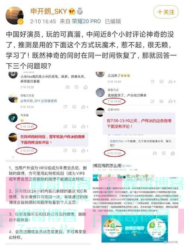 奇怪的是,在面对这三个问题后,卢伟冰和雷军的微博竟然连夜"消失"了。就在大家揣测质疑的时候,神奇的事情发生了,卢伟冰的微博消失了。随后,卢伟冰表示这条从来没有删过,其实是友商限制了其微博流量。但是这番言论再次遭到打脸,无论是这条微博还是雷军的转发,中间近8个小时的评论不见了,推测是用了恢复删除微博的"后悔药"功能。