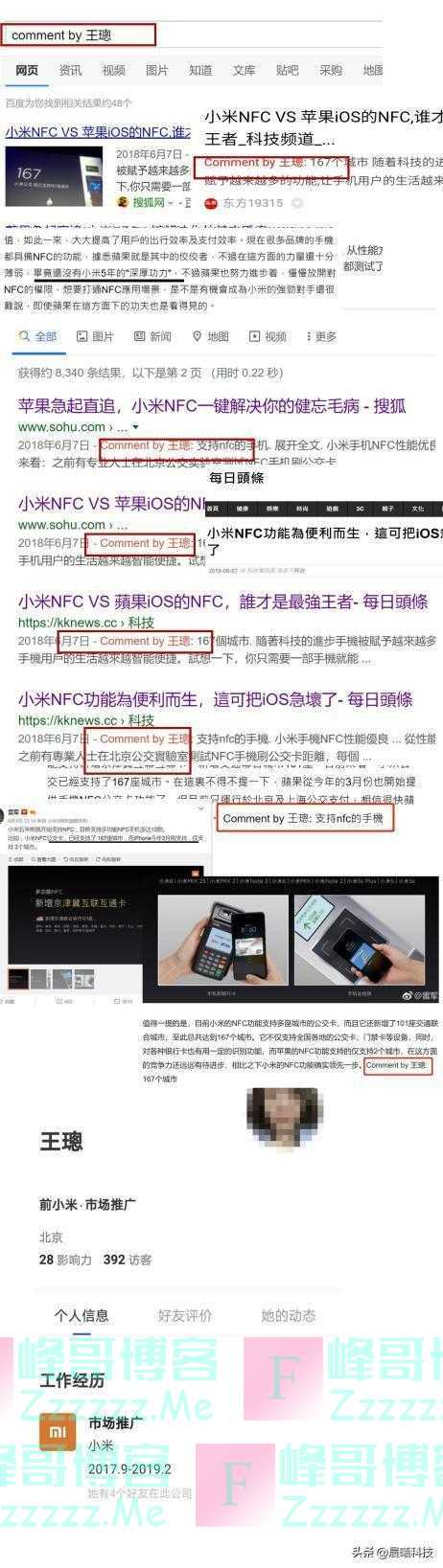 原以为小米被抓包后会收敛一点,没想到近期再被网友曝出竟然多次发稿抹黑苹果。数天前,有网友爆料在第三方搜索平台搜索"comment by 王璁"后,会出现大量对苹果进行抹黑的稿件,而王璁本人正是小米员工。其中不乏"苹果奋起直追小米"、"苹果毕竟还没有小米5年的深厚功力"、"小米把iOS急坏了"等奇葩言论。