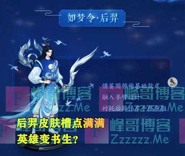 看完嫦娥再来看看后羿,后羿的槽点就更多了,在很多玩家心中,游戏中的后羿应该贴近中国古典传说中的后羿形象,也就是高大伟岸、英气逼人,可是这次的如梦令怎么看都像是一个白面书生,与英雄气概一点都不贴边,根本看不出为了民族大义要去射日的样子。基于以上两点,很多玩家就感觉自己这不是上当了么!