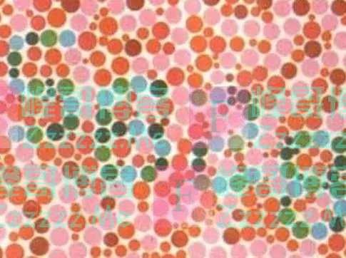 接下来难度升级,我们再来看一下第2张色盲图,对于第2张色盲图,如果大家是色弱或者是色盲的话就不能够分辨出来了,而且这个色盲图中的颜色还是比较凌乱的,如果大家是没有红绿色盲的话,相信对于这个色盲图中的东西也能够一眼看出来,那就是一个眼镜。