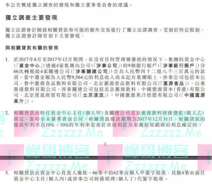 根据这份报告,2017年8月-12月期间,在没有任何管理层审批的情况系啊,集团的资金中心透过4家集团内公司的9个银行账户分66次转账给4家关联公司,根据双方达成的协议安排,汇源果汁合计向北京汇源饮料提供约人民币42.83亿元的短期贷款,年化利率10%。相关贷款是由时任资金中心主任及关联公司北京汇源饮料财务总监二人商定执行的,没有签署书面合同。这两位执行人直接将相关贷款归类为集团内部银行转账,认为不需要上报集团管理层审批,只需由集团资金中心负责人审批。