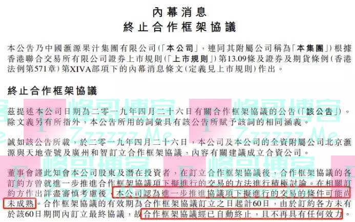 第二次“卖身”时,汇源果汁的境况已经大不如前。2019年年4月26日,汇源果汁宣布与天地壹号成立合资公司。根据公布的框架协议,天地壹号等以现金方式向潜在合资公司出资人民币36亿元,占股60%;汇源果汁则以资产出资方式出资24亿元,其中包括汇源果汁的商标。在短短3个月之后,该计划夭折。公司在公告中称,认为进行交易的条件可能尚未成熟,终止了与天地壹号等企业的合作。