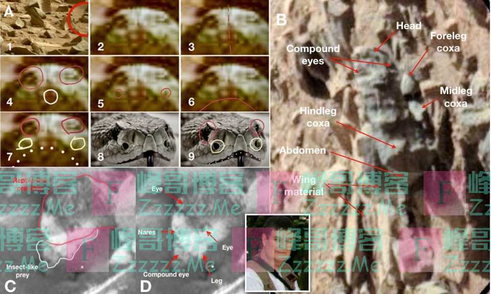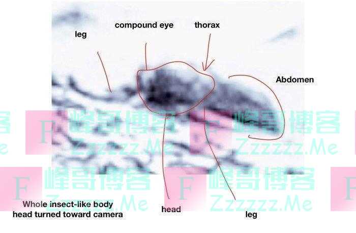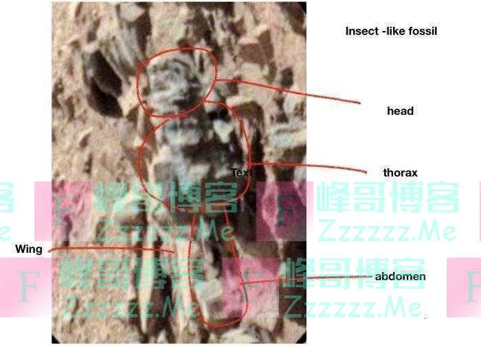 图解:图片上有形似蟑螂,黄蜂,甲虫之类的化石影像,威廉罗慕斯尔教授认为这就是火星上面的生命迹象。