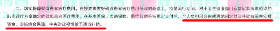 意思就是,如果你不幸中招新冠肺炎,那么治疗费用,首先由医保这些国家保障来先报销掉一部分,剩下的个人承担的部分,由中央财政补贴60%。