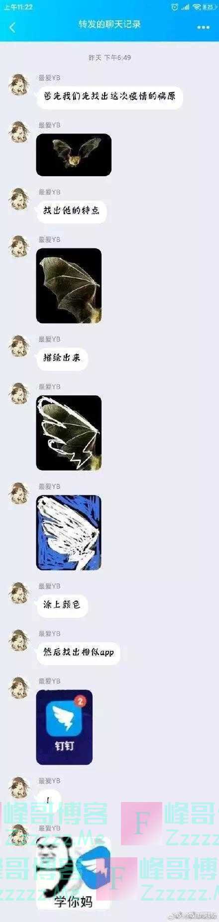 原来,有网友将钉钉的这个梗,与疫情的罪魁祸首蝙蝠联系到了一起。更让人不可思议的是,如果仅仅用图片中看,丝毫都没有违和的感觉。