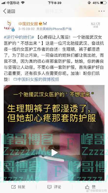 前线的医护们有一半以上都是女性,即使可以忍着不喝水不吃饭,挺住生理期的疼痛,但流血是没办法控制的。