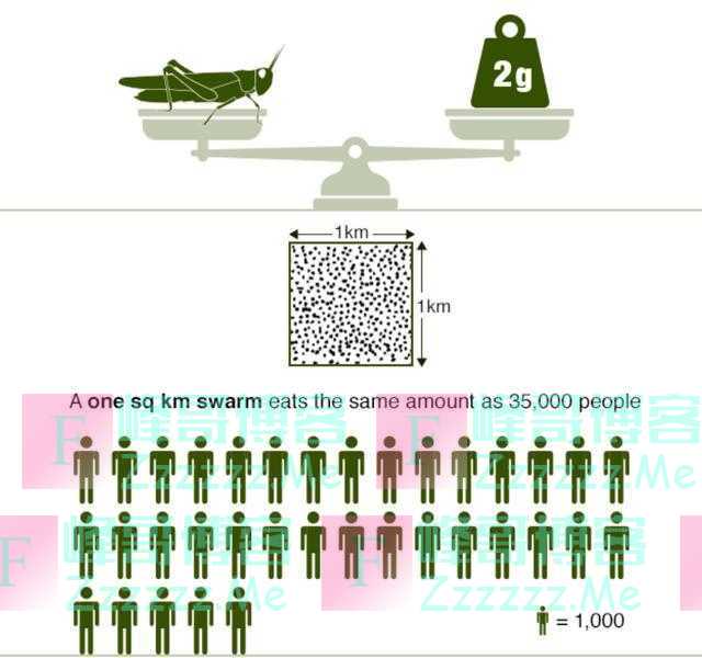 蝗灾泛滥之所以那么恐怖,一是因为蝗虫太能吃,二是它们的数量太庞大。一只沙漠蝗虫每天可以吃掉相当于自己体重的粮食,大约两克左右。不要小看这个数字,因为蝗虫是成群结队的,数量庞大,一平方公里的蝗虫一天大约能吃掉35000人的粮食。