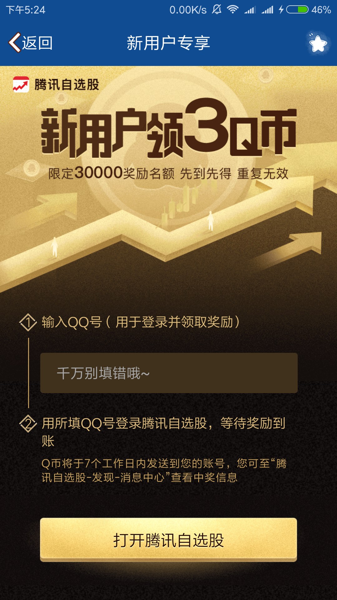 活动地址:http://finance.qq.com/h5/new3.htm 输入QQ号领取,下载APP使用QQ登录,坐等到账即可