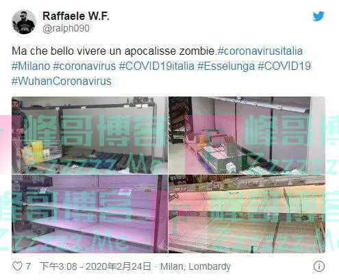 对于当局的措施,意大利的民众比较配合。伦巴第地区的人们开始疯狂囤积食物和生活必需品,超市被抢购一空。