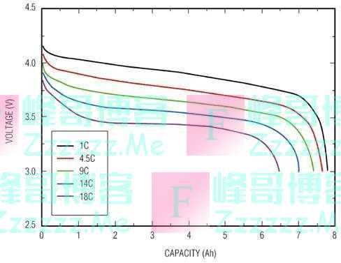 还有最重要的,电池放电电流越大,可以放出的容量越小。如图,以1C放电,放电量接近8Ah,而以18C放电,放电量仅有6.5Ah。就好像倒酸奶,倒得快,杯壁上残留很多,慢慢倒却也能倒干净。