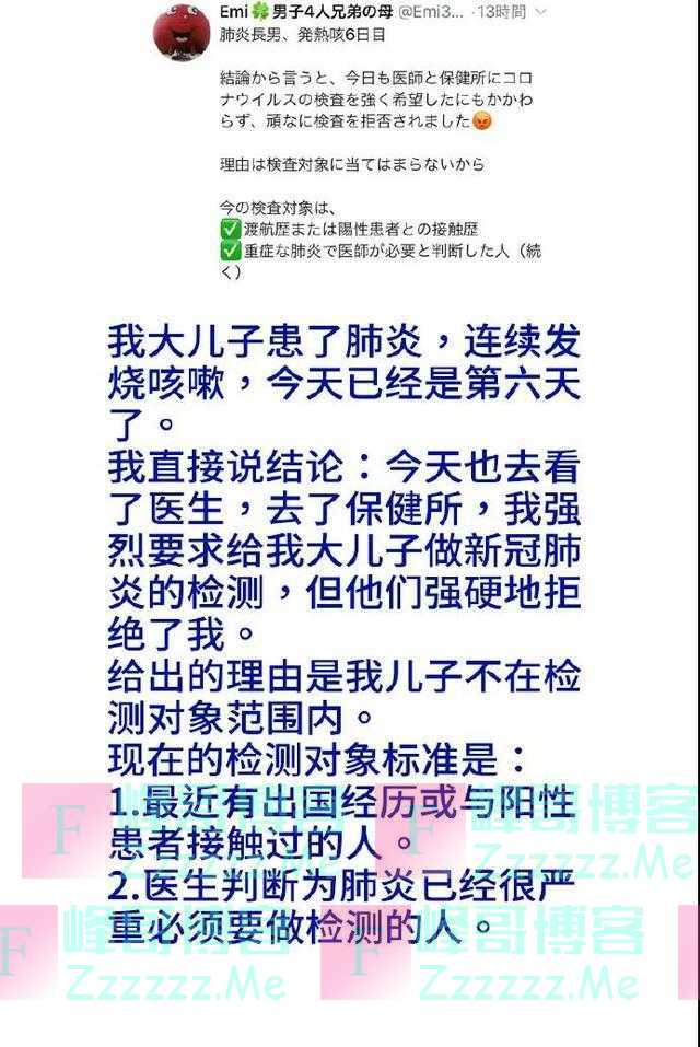 日本网民反应日本政府在执行的新冠检测标准门槛过高,很多疑似却被拒绝做新冠病毒检测。