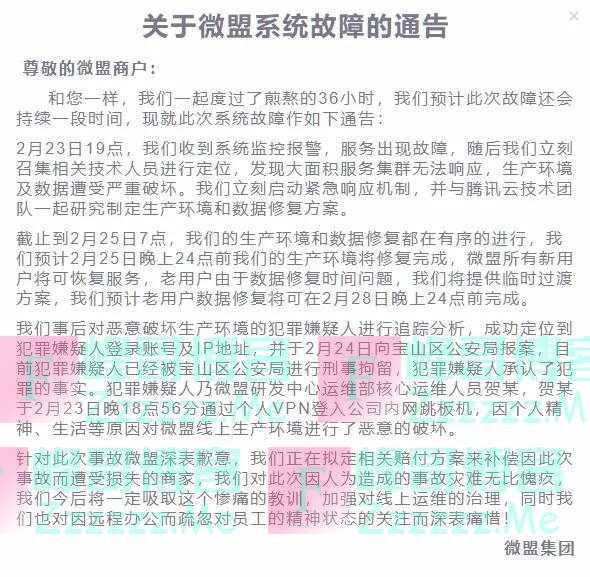 2 月 25 日,微盟公司官方通报了一则系统故障通告: