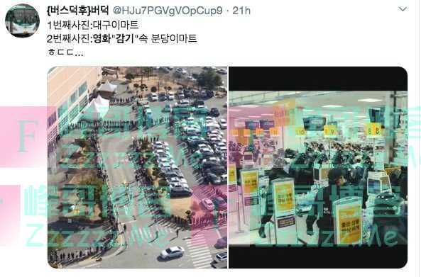 推特网友贴出2张图:左图为24日的大邱市超市门口;右图为电影《流感》中市民抢购的画面。