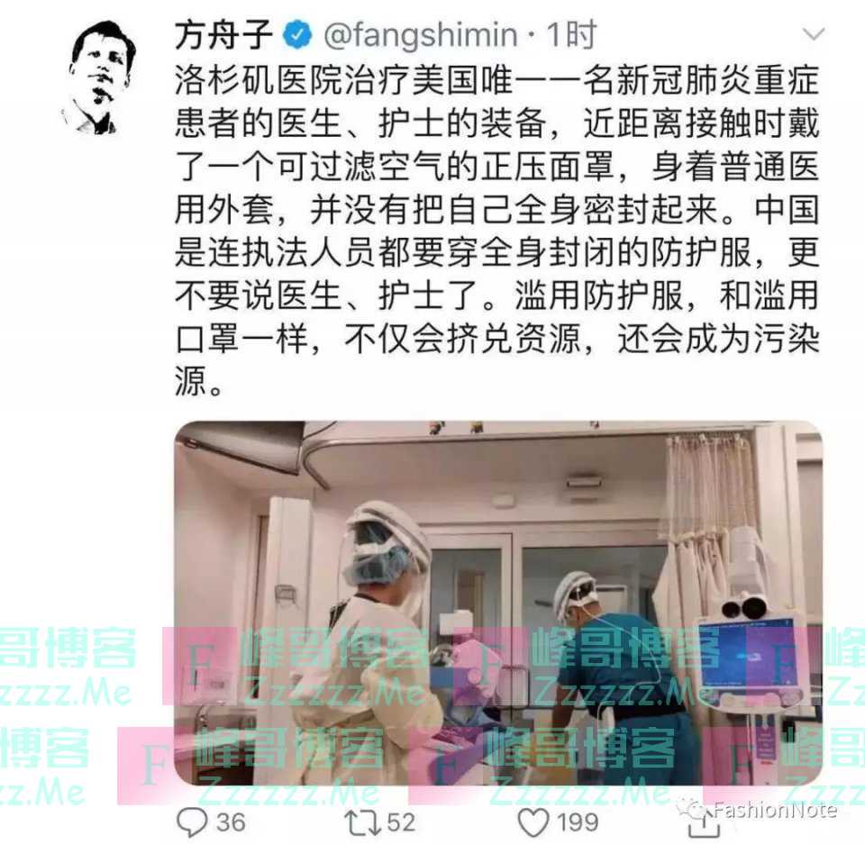 方舟子对医护人员使用防护服也有意见,认为是浪费医疗资源,而且还会造成污染。