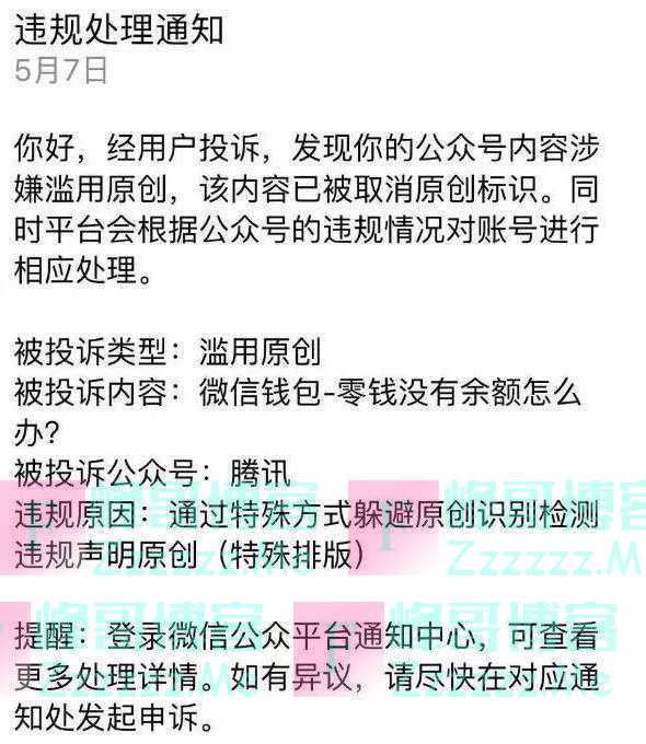 去年5月份,腾讯官方微信公众号一篇文章因为被网友投诉"滥用原创",被取消原创标识。微信违规处理通知给出处理的原因是"通过特殊方式躲避原创识别检测违规声明原创(特殊排版)"。腾讯公众号也在网友留言区表示:"已被微信公众平台判定滥用原创,取消原创。请大家以我为鉴。"