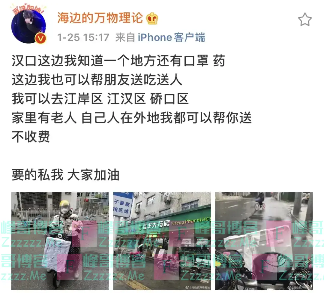 吴悠干脆找来一张纸,写上“免费帮送药、食、口罩”,挂在电动车前,又在微博朋友圈都发了消息: