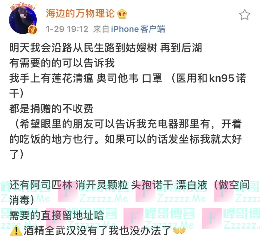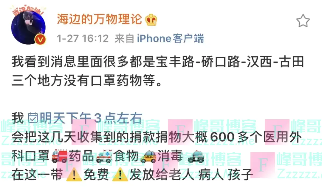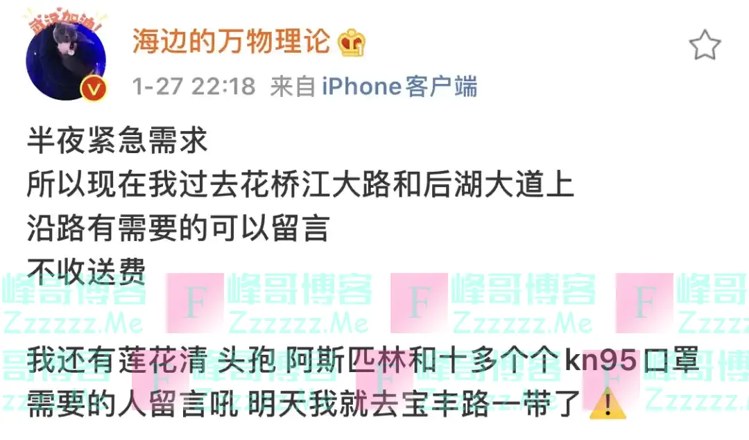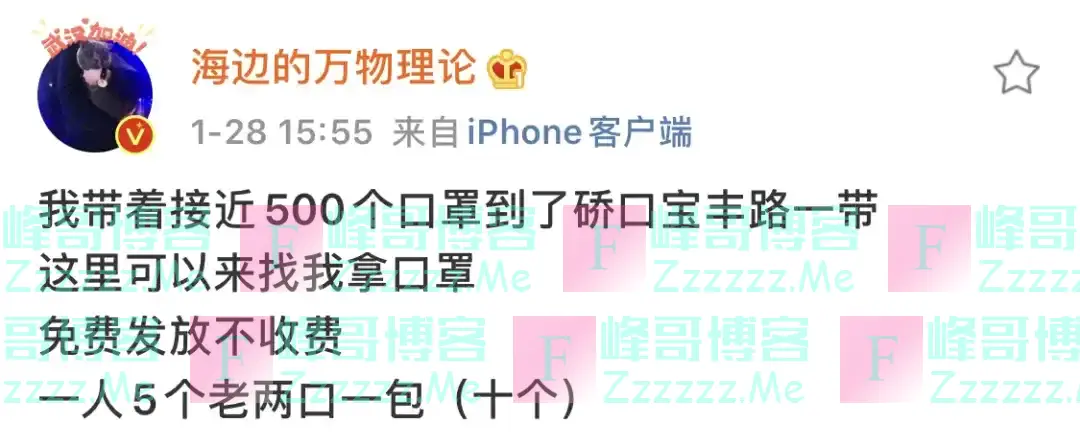 他在微博上发布了消息:我囤有口罩,有需要的,免费送。